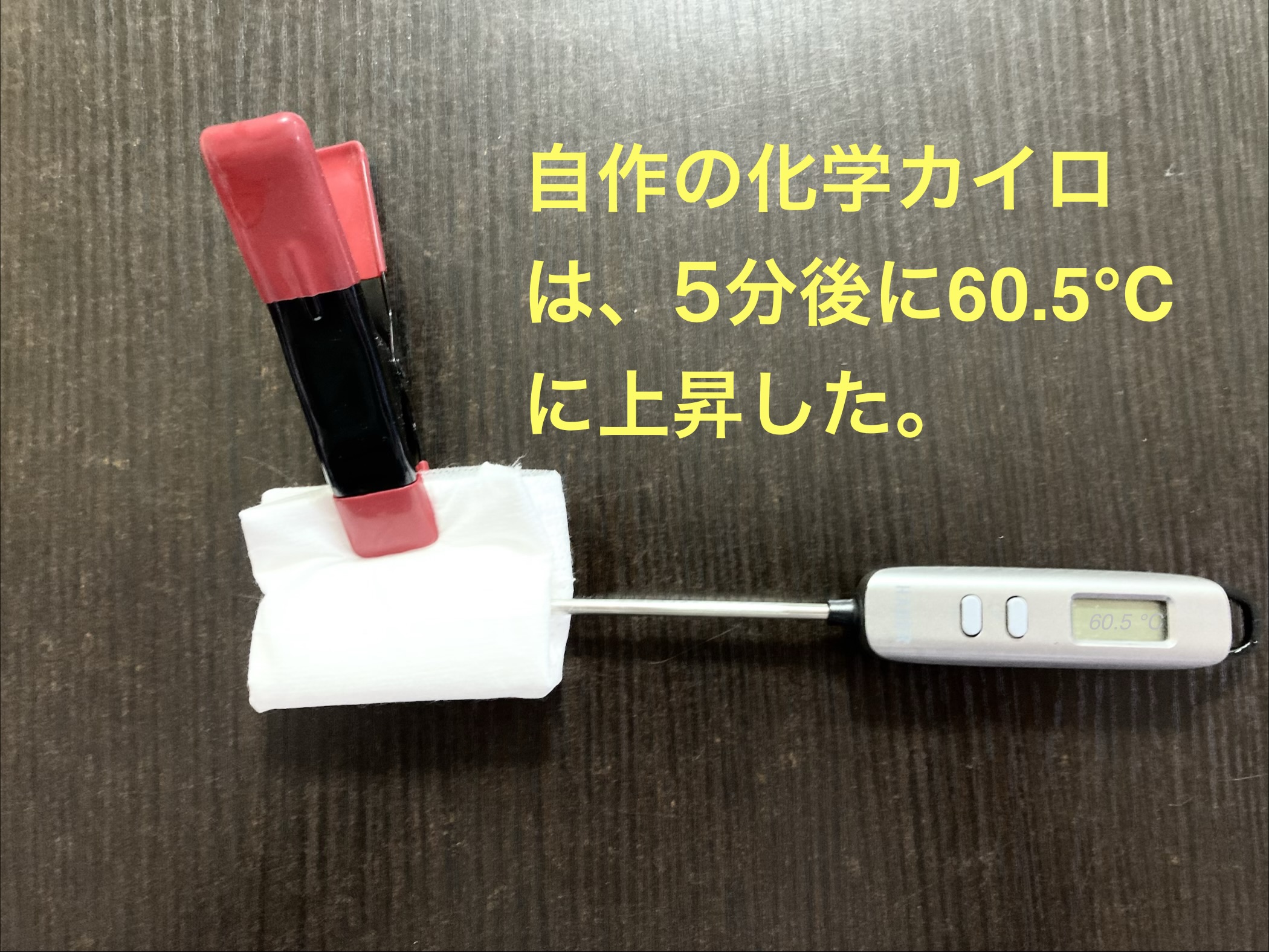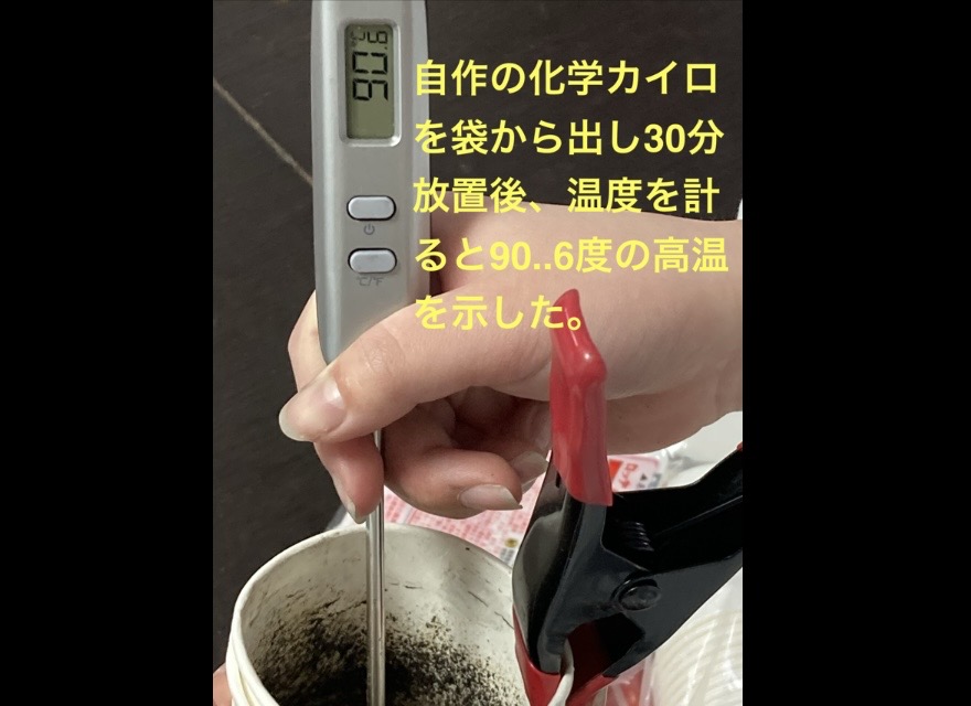 自作の化学カイロは、5分後に60.5℃に上昇した。その後、不織布の袋から取り出して攪拌を続けると90.6℃にまで上昇した。